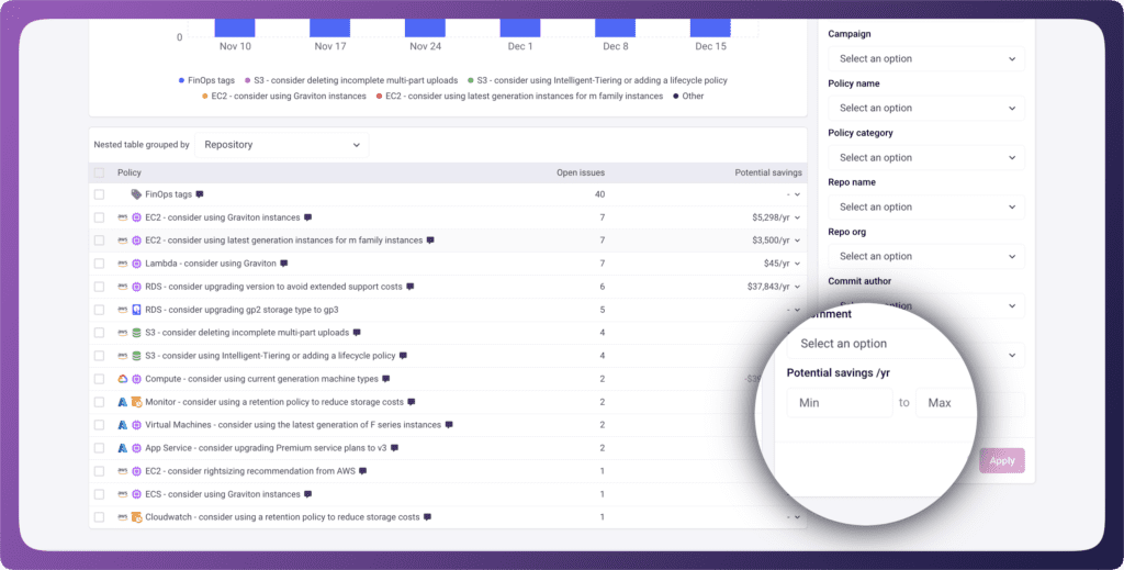 For a mid-tier enterprise spending $10M/year on cloud, a $10K/year saving is worth pursuing. For a large enterprise spending $100M/year, that threshold might be significantly higher. You can now filter issues by potential savings to focus on what actually moves the needle for your organization. Combined with our recently released risk, downtime, and effort categorization, you can prioritize the issues that deliver the highest ROI for the time invested.