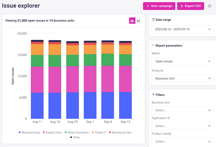 Track progress at scale: See which teams are acting, which campaigns are advancing, and where help is needed. For example, in the following screenshot it’s clear that the E-Commerce and Supply Chain business units are fixing significantly more issues, so you can learn from their process, and promote those best practices across the enterprise.