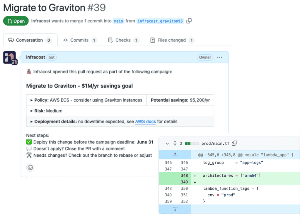 That’s why we’re excited to introduce Infracost AutoFix. With AutoFix, you can enable pull request generation at the Campaign level—helping FinOps teams measure and speed up the mean-time-to-remediation, just like modern security teams do today.